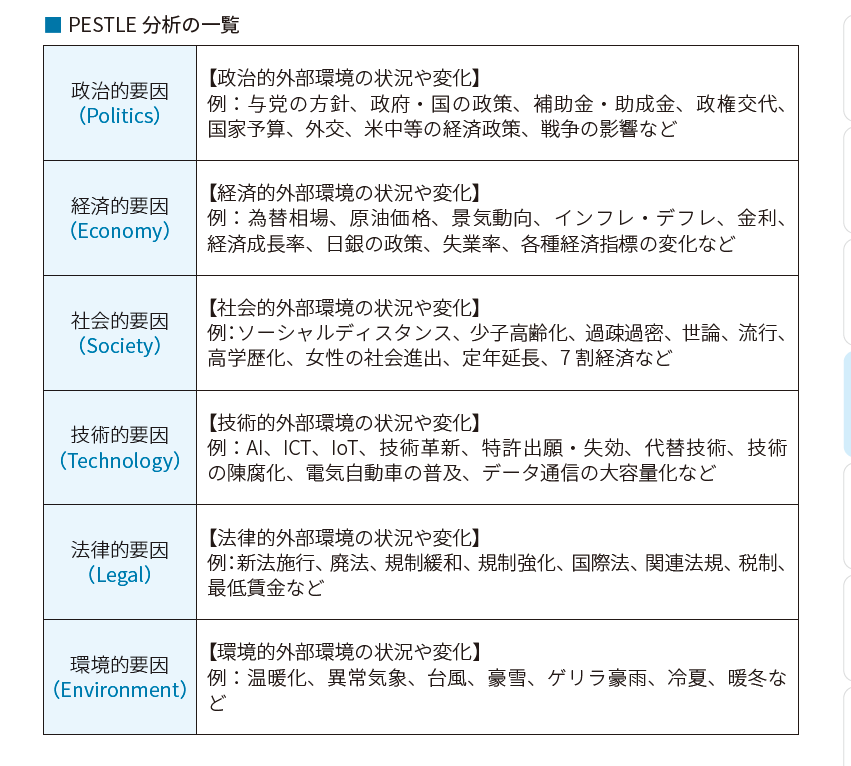 企業活動は社会経済環境の影響を不可避的に受けます 。自社の方向性を決めるには、外部の状況と変化の分析が必須です 。